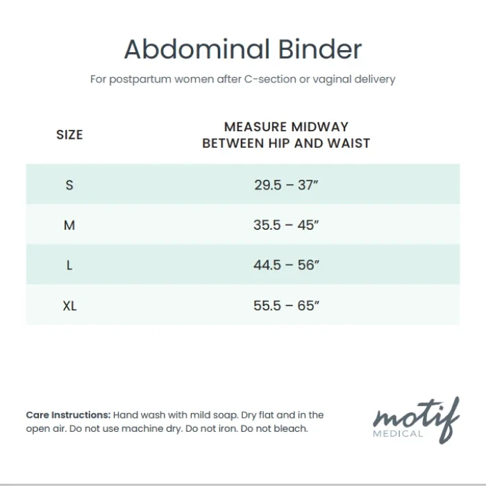 The Motif Abdominal Binder is a postpartum maternity compression binder that is designed to support and stabilize the abdomen after C-section or vaginal delivery. We recommend using the binder for 4-6 weeks after delivery, removing the binder every 2-3 hours for 10-20 minutes.
